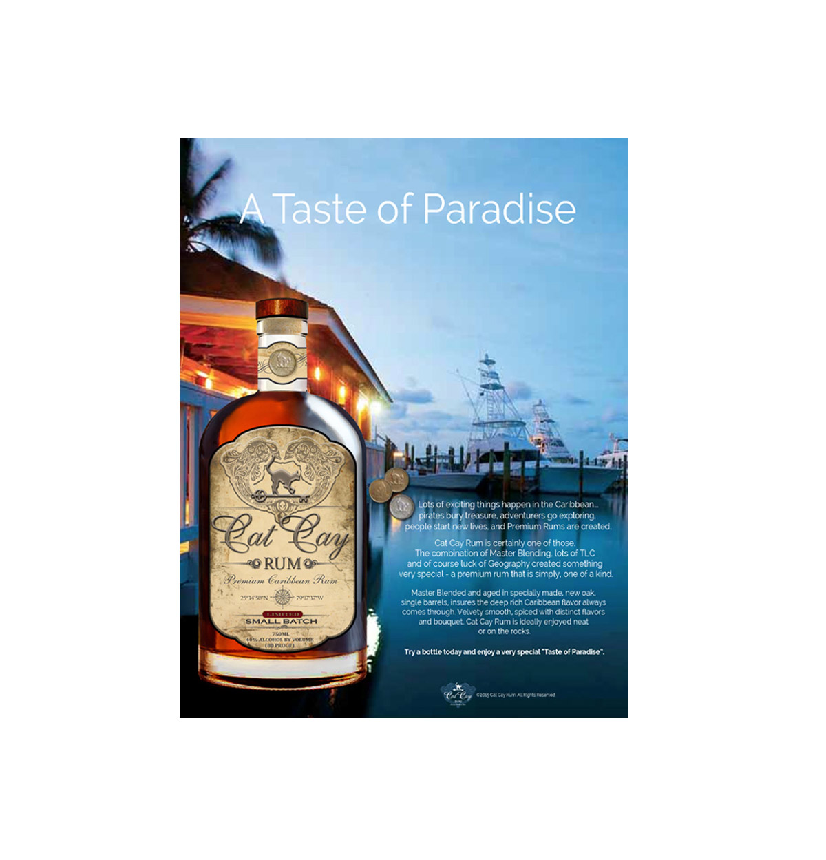 Master Blended and aged in new oak, single barrels, insures the deep rich Caribbean flavor always comes through. Velvety smooth with distinct flavors and bouquet, Cat Cay Rum is ideally enjoyed neat or on the rocks.